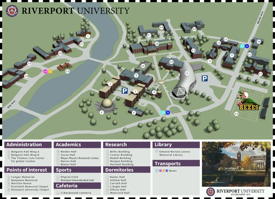 The Riverport University Map contains a layout of the campus and key locations on the grounds. The following below are a list of locations within Riverport University as described by the map found at the front of the campus.