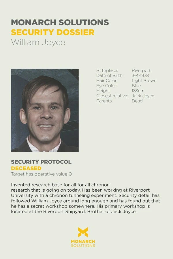 William Joyce Dossier is a document Narrative Object found in the first Junction Impact of Quantum Break. The document is a dossier of William Joyce written by Monarch Solutions.